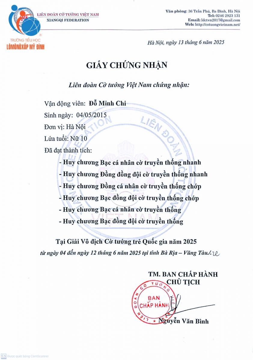 Với tình yêu dành cho bộ môn Cờ tướng, Minh Chi đã không ngừng rèn luyện và thử thách bản thân qua từng ván cờ. Tại Giải Vô địch Cờ tướng trẻ Quốc gia năm 2025 được tổ chức tại tỉnh Bà Rịa – Vũng Tàu, em đã xuất sắc mang về một loạt huy chương tại các nội dung thi đấu: